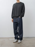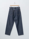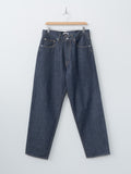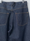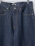 An Auralee signature denim. These feature a wide fit with a tapered leg, cut from a proprietary seasonless denim developed to retain the crisp texture of raw denim even after washing. This fabric offers subtle elasticity, a textured surface, and exceptional durability. Details include a classic 5 pocket construction and a zip fly.