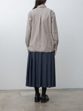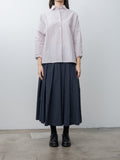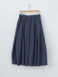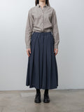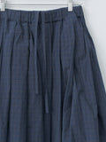 A pleated midi skirt with a voluminous A-line silhouette made from a crisp navy check cotton with a washed finish. Features an elasticated waistband with inner drawstring, side pockets, and a softly gathered hem for natural movement.