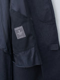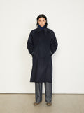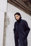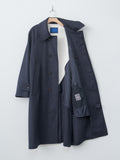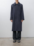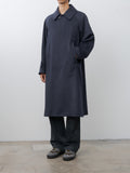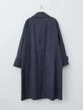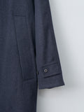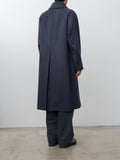 A balmacaan coat with a relaxed A-line silhouette that drapes softly with movement. It is crafted from premium Himalaya Loden wool from Austria—a dense, smooth, and naturally weather-resistant wool-alpaca blend known for its refined finish and durability. The coat features a concealed collar tab for fastening the collar upright, real horn buttons, raglan sleeves, and a back inverted pleat.