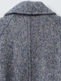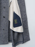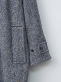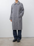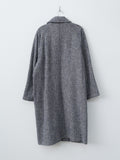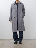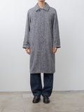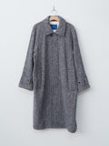 Document's signature oversized balmacaan coat, crafted from blue-nep Donegal tweed woven in Ireland. The fabric is produced by Magee, a historic mill in Donegal known for its richly textured yarns. Design features include a hidden collar tab for upright fastening, raglan sleeves, and real horn buttons — a timeless outerwear piece with depth, structure, and warmth.