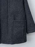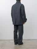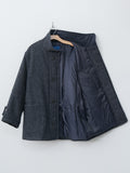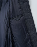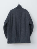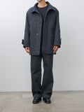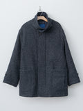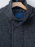 This half-length coat features a structured, car-coat silhouette crafted from dense wool Kemp Melton, offering natural warmth, durability, and a rich, nepped texture. It includes a detachable cotton lining trimmed with shearling for added insulation, a high stand collar with button fastening, flap pockets, and a clean front closure finished with real horn buttons. The interior is padded with lightweight 3oz insulation, while the ultrasuede-lined collar provides a soft, comfortable touch against the skin.