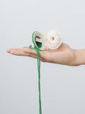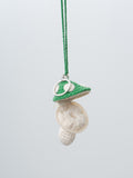 A crocheted mushroom keychain featuring a zippered cap that opens to a small pouch for coins or other small items. Includes a metal key ring and green braided strap for easy carrying.