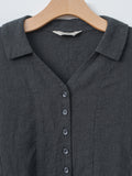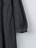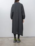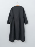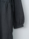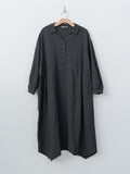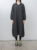 A pullover dress crafted from a lightweight linen–cotton blend with a subtle mini houndstooth, offering a gently textured, breathable feel. Details include a shallow open collar with a short button placket, dropped shoulders, side pockets, long sleeves with softly gathered cuffs, and an asymmetric hem that adds quiet movement.