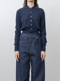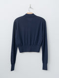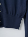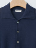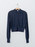 A fitted, cropped polo cardigan made from lightweight wool. It features a spread collar, a fully buttoned front, and ribbed hem and cuffs. Designed to pair well with high-waisted trousers and skirts.