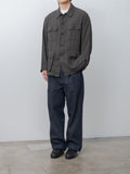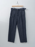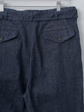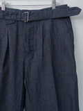 A double-pleat belted trouser crafted from a 9oz indigo-dyed selvedge denim blended with natural neps and linen. It is slow-woven on vintage looms to develop rich slubs and a texture that deepens in color and character with age. Features a wide, straight leg fit, double forward pleats, front crease, a matching removable belt, side pockets, back flap pockets, and a washed finish.