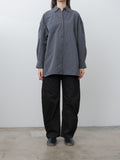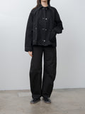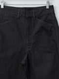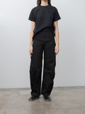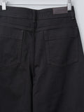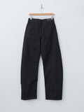 Lemaire's signature High Waisted Curved Pants in heavy denim in a deep black wash. It has a thick, round hand with a visible twill weave. They are high-waisted with a concealed zip-fly closure and feature long, curved legs with a sculptural silhouette. Other details include 5 pocket construction including a ticket pocket and contrast stitching.