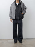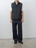 A lightly padded vest inspired by the classic M-65 military jacket. It is crafted from durable back satin cotton with a washed finish that gives it a vintage, worn-in appearance. Design details include gusseted flap pockets with snap closures, a zip and snap button front, and a high stand collar for added warmth and structure. Regular fit, can be layered under puffer jackets or coats.