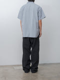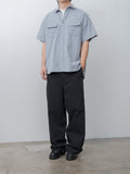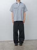 A relaxed fit, wide work pant crafted from a midweight chambray-woven cotton drill featuring subtle colour contrasts and a textured surface with a rich, vintage-inspired character. Details include a straight, wide fit through the hips and legs, a high rise with a full inseam, side pockets, and a back patch pocket.