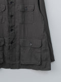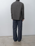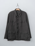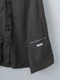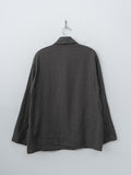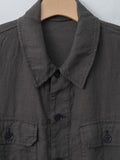 A relaxed fit shirt jacket crafted from an irregular mesh weave of fine linen and silk yarns, offering a light, breathable construction with a subtle nep texture. Features four patch pockets with gusseted bottoms for the hip pockets, an inner zip pocket, tonal buttons, and a washed finish.