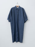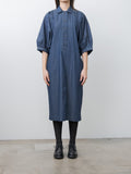 A kimono-sleeve pullover dress with a loose, draped silhouette and voluminous half sleeves. Made from light to midweight denim, it features contrast white stitching throughout. Design details include a spread collar, a half placket, gathered sleeves with buttoned cuffs, side seam pockets, and a midi-length hem.