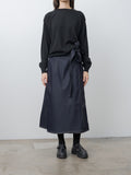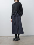 The Stieglitz Denim Skirt is a midi-length wrap skirt crafted from midweight raw denim that offers a structured feel. It features an A-line silhouette, contrast topstitching, and a wide waistband with belt loops. Two long tonal ties can be styled into a bow or left to hang loosely at the side.