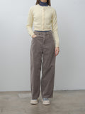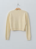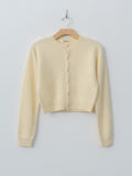 A cropped crewneck cardigan crafted from hand-selected baby alpaca fibers, using only the finest, thinnest strands. The yarn is spun through a traditional worsted process and knitted into a bright white base, then garment-dyed and finished with a soft fur treatment that lends the surface a gentle nap and plush texture. Finished with a front button closure, ribbed hem and cuffs, and a regular, cropped fit.
