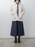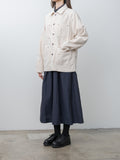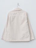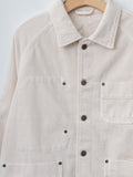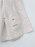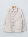 An unlined denim work jacket with a relaxed, boxy silhouette. It is made from a midweight cotton denim with a structured hand and tonal topstitching throughout. Features a button front with metal shank buttons, half raglan sleeves, patch pockets with metal rivets, and a straight hem.