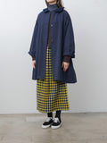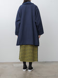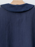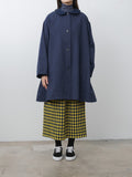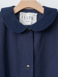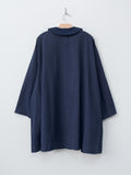 A lovely single-breasted coat with an oversized, flared silhouette and a corduroy round collar. It is made from a heavyweight cotton that provides structure while remaining suitable for three-season wear. Details include shaped, voluminous sleeves, a horn button front closure, and side seam pockets. Unlined.
