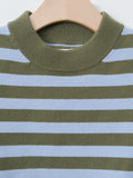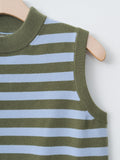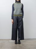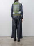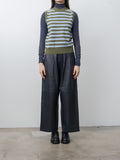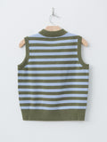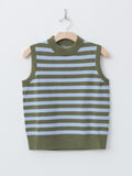A cashmere-blend vest with a loose, boxy silhouette and cropped length. It has a soft hand and gentle stretch for comfort. Details include a round neckline, ribbed trims, and a blue and olive stripe pattern throughout.