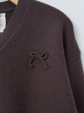 A boxy, cropped lambswool cardigan featuring a bow detail at the front. It features a high v-neckline, button-front closure, and ribbbed hem and cuffs.