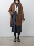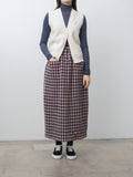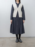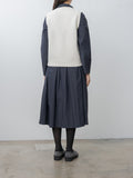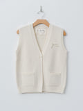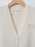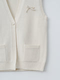 An open-front lambswool vest with a loose fit and cropped length. It features a V-neckline, a single button closure, and a bow detail at the front for a playful finish.