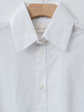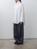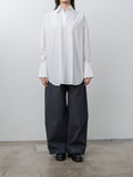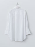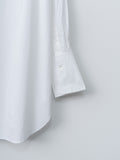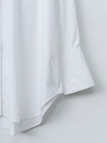 The Molly shirt is an oversized shirt with a beautiful drape made from a crisp, lightweight cotton poplin. It features a high stand shirt collar, elongated cuffs, dropped shoulders, and a dramatic curved hem.