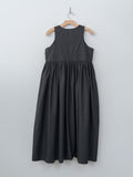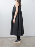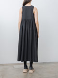 A sleeveless, midi dress made from a crisp, lightweight cotton poplin. It features a rounded neckline with subtle gathering at the front, horizontal seams across the bodice, a chest pocket, side seam pockets, and gentle gathers at the waist that create fullness through the skirt. Relaxed fit.