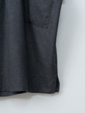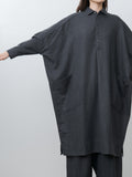 The Framer Dress is a knee-length pullover dress with a shirt-style opening to the waist and delicate button fastening. It is crafted from a soft wool-cashmere flannel blend in charcoal. The dress features dropped armholes, tilted patch pockets at the front, side slits at the hem, and a crossover pleat through the low back yoke panel. Relaxed fit.