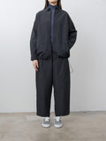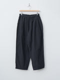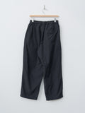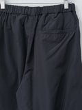 Casual wide leg trousers with a gently tapered silhouette, made from high-density cotton nylon taffeta. A salt-shrink finish gives the fabric a crisp, dry texture, while garment dyeing adds subtle seam puckering and a relaxed appearance. Other details include an elasticated waist with an inner drawstring, front outward tucks, side pockets, a back welt pocket, and an adjustable hem for creating a more tapered silhouette.