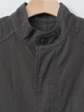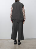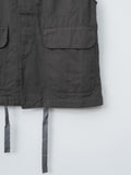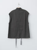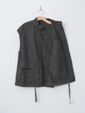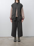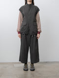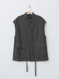 A vest with a relaxed, boxy silhouette inspired by traditional hunting jackets. It is made from a midweight cotton Katsuragi fabric treated with a catch-washer finish for a crinkled texture and then garment dyed. The design includes three pockets—two flap pockets at the waist and one inner chest pocket—and a drawstring hem for adjustable styling.