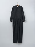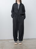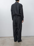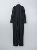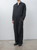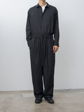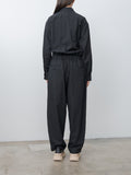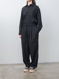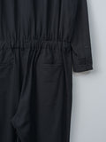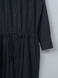 For simplified dressing: a jumpsuit made to look and feel like a shirt tucked into easy trousers. It is made from cotton panama, a high-density, lightweight cotton fabric using tightly twisted yarns, giving it a dry touch and excellent breathability inspired by tropical military textiles. Features a regular collar, button-front closure, chest pocket, elasticated waist with drawstrings, zip fly, side pockets, and back welt pockets.