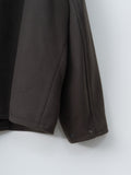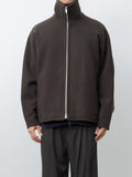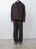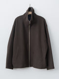A clean, minimal blouson with a boxy fit, crafted from Super 140’s melton wool—a fabric that offers structure and warmth while remaining lightweight and comfortable. It features a large stand collar that can be worn upright or folded down, a two-way zip front, and adjustable cuffs and hem with snap buttons.