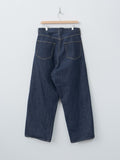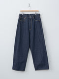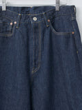 Yoko Sakamoto's wide-leg baggy jeans, crafted from exceptional selvedge denim woven slowly on traditional shuttle looms in Okayama Prefecture. Made from carefully selected cotton fibers spun for optimal texture and hand feel, the raw denim is left entirely unprocessed, preserving its crisp, substantial character and allowing it to evolve beautifully with wear. Details include a structured waistband, 5-pocket construction, and a relaxed, wide-leg silhouette.