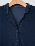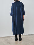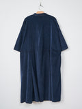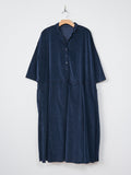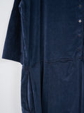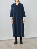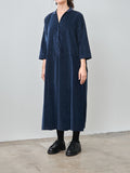 An open collar dress from AdF in a lightweight, stretchy cotton velvet with a smooth hand feel. Details include a half buttoned placket, box pleats in the front and back, 3/4 sleeves, and side seam pockets. Relaxed fit.