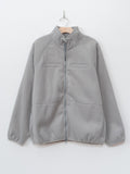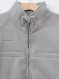 A loose fit fleece jacket made from a lightweight blend of smooth poly and hollow-core yarns. It has a soft, brushed feel and offers warmth while remaining breathable. Details include a two-way zip, stand collar, elastic cuffs, zippered chest and hand pockets, partial mesh lining, and a straight hem with an adjustable drawcord.