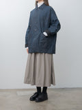 Casey Casey’s signature long-length work jacket, crafted from washed pigment wax cotton. Midweight with a structured, crisp hand and a lightly waxed outer, the fabric develops subtle tonal variations and irregularities that make each piece unique. Features a corozo button front closure, dropped shoulders, front patch pockets with button closures, a chest pocket, and an unlined construction with internal patch pockets.