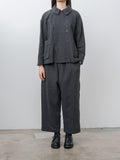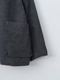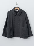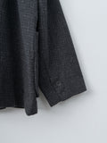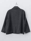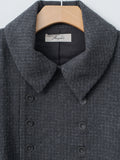 A softly structured jacket crafted from cotton wool seersucker. The fabric has a subtle puckered texture that creates gentle volume and breathability, balanced by the wool’s natural warmth. Details include a double-breasted front, small rounded collar, and dropped shoulders, curved front patch pockets, buttoned cuffs and cotton lining.