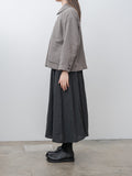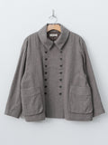 A softly structured jacket crafted from cotton wool seersucker. The fabric has a subtle puckered texture that creates gentle volume and breathability, balanced by the wool’s natural warmth. Details include a double-breasted front, small rounded collar, and dropped shoulders, curved front patch pockets, buttoned cuffs and cotton lining.