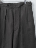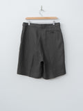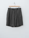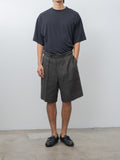 A wide-leg gurkha short with a structured waist and two in-pleats at the front. It is made from an irregular mesh weave in linen and silk that provides a light, breathable feel suitable for warm weather. Details include side waist belts, extended tab waist with button closure, side seam pockets, and a back welt pocket.