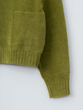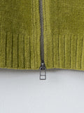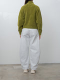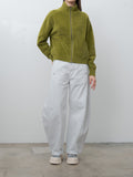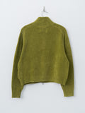 A high neck zip jacket featuring an organic cotton chenille with a soft, textured surface. It has a loose fit with a cropped body. Details include a two way zip, front patch pockets, raglan sleeves and ribbed neck, cuffs and hem.