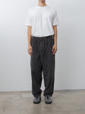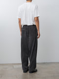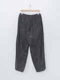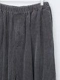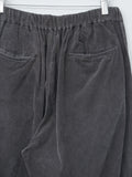 Yoko Sakamoto's signature silhouette wide easy trousers in natural garment dyed micro corduroy. This version is lightweight with a superb soft texture and a rich tone from the sumi ink garment dye. Details include a front two-tuck design, elasticated waist with inner drawstrings, side pockets, back welt pockets, and a wide fit with a tapered leg.